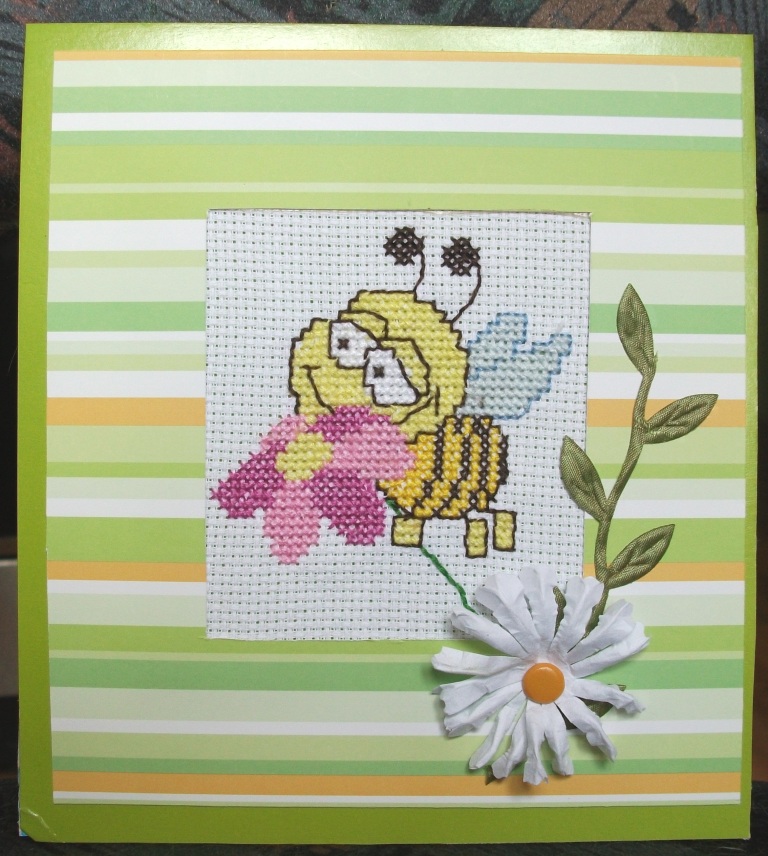 недавно выбирала мулине и на глаза попалась схемка с прикольной пчелкой - сразу в голове сложилась открытка - "Самой трудолюбивой пчелке!" -реализована и подарена женщине, которая поражает меня своей энергией, юмором и оптимизмом