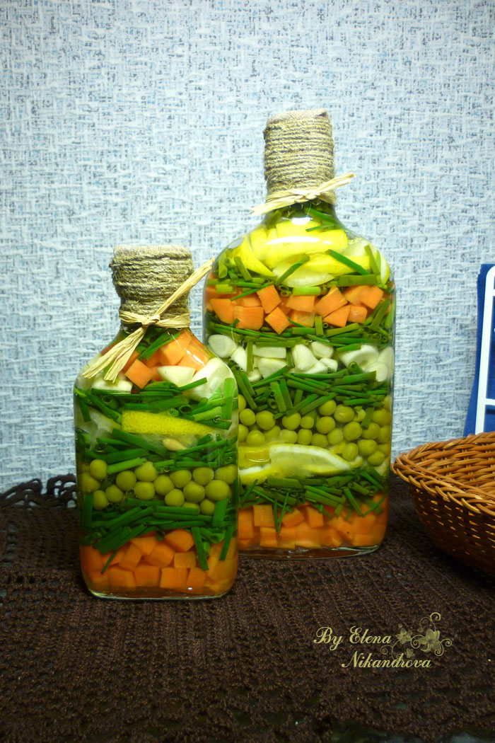 И вот такие бутылочки недавно дарила. Делала первый раз, заливала уксусом. Правда овощи потом цвет поменяли, немного тускнее стали, но мне тоже так нравится