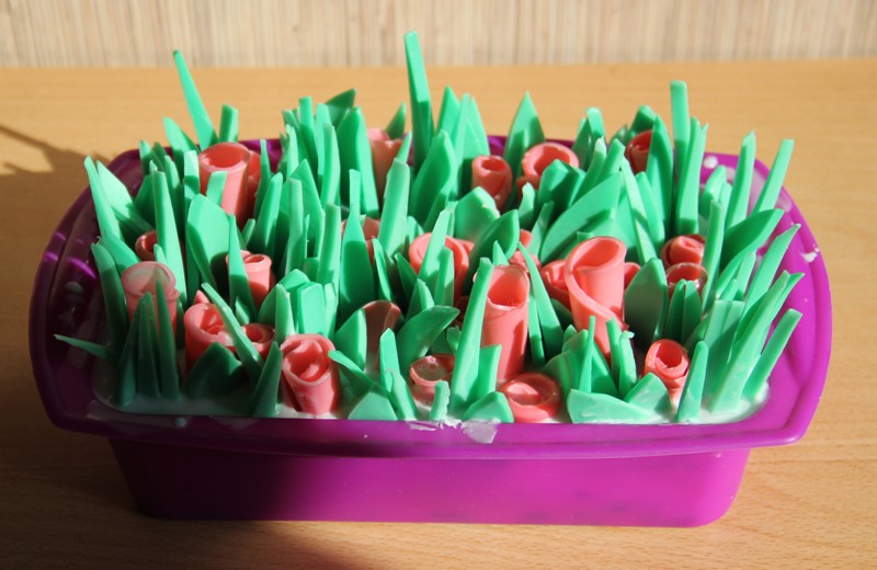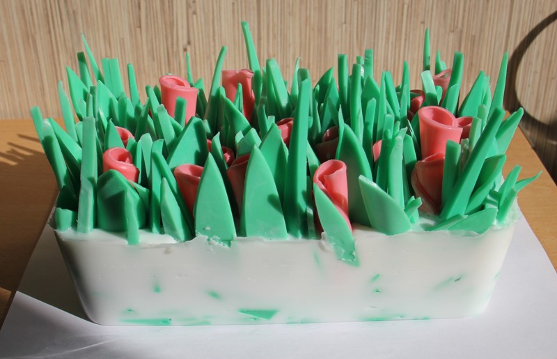 Мыло из основы. Мне самой хочется попробовать нулевое мыло, но дочь говорит , что не надо заморачиваться. Мы с этим мылом вдвоем провозились часа 3.Получился кусок 2,3кг. Сначала заливали прямоугольники толщиной примерно 2см зеленого цвета, потом их резали. Потом для листьев прямоугольники тонким слоем.для цветов тонкий слой в круглых формах.Все это надо подождать когда стынет, вырезать, свернуть.Да ты сама знаешь.Послойно залили в прямоугольную форму. Надо успеть все воткнуть, что нарезали, потом делить до верха.Сам процесс интересен.Застывшее достали из формы и нарезали. Вот фото до нарезки.Катя поделись рецептиком "с нуля"Мы уже заказали красители швейцарские в РИДе.sevsiu писал(а):красители покупала в магазине soapchik.ru, мне кажется в мечте мыловара тоже они были.galianna писал(а):Спасибо, Катя. Я уже тоже прочитала про швейцарские немигрирующие красители. Катюша, а где ты их покупаешь?