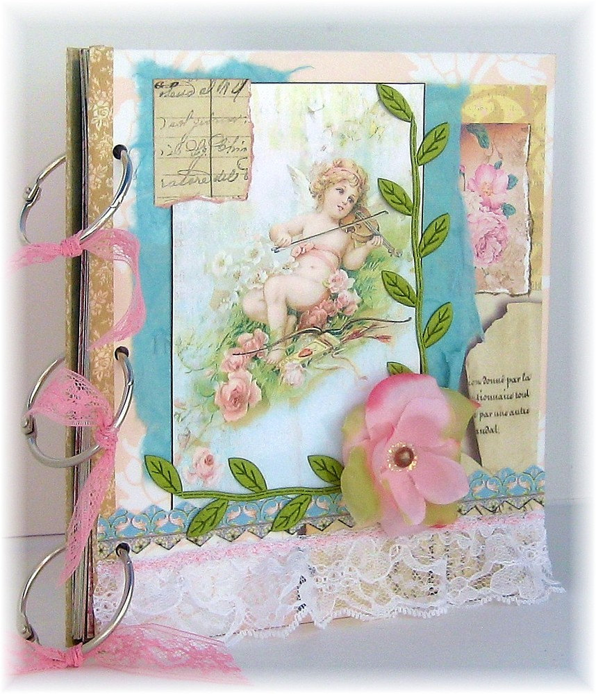3. Декор: для страничек можно использовать как бумагу, так и ткань. Из украшений лучше всего подойдут жемчуг, стразы, перламутровые пуговицы, деревянные и металлические украшения (ключики, замочки, сердечки, голуби), старинная лепка, цветочки (бумажные, вязанные, текстильные), ленточки, тесемочки, старинное слегка помятое кружево, рюши.