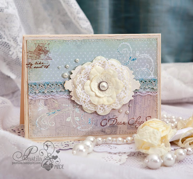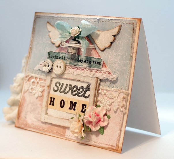 1. Цветовая палитра: открытки и скрапстраницы в этом стиле выполняются в светлых, пастельных, дымчатых, приглушенных тонах, преимущественно в белом, нежно-розовом и нежно-голубом, в цвете слоновой кости. Не смотря на приглушенность тонов, можно использовать яркий элемент, акцент или орнамент, но так, чтобы он не выбивался из основной гаммы и не утежелял композицию.