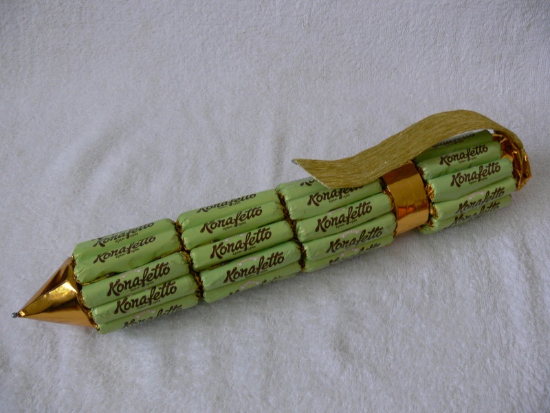 Вот такой приятный подарок можно сделать своими руками)Красивую, удобную ручку обклеить двусторонним скотчем, или обмотать нитками, чтобы было не заметно, вкусненькими конфетами)