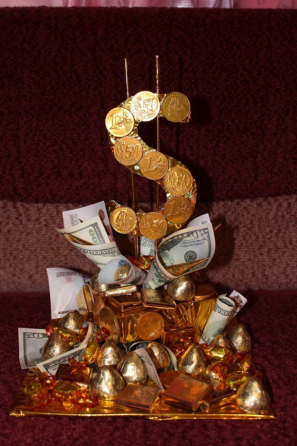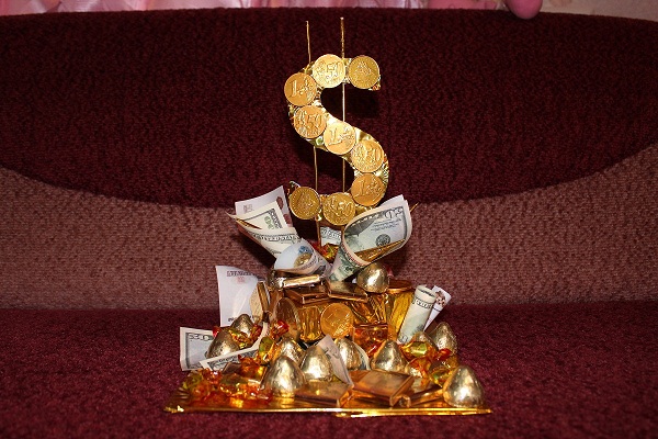 Большое спасибо! Стараюсь! Я бы не сказала что дорого, конфеты подбирались по цвету и фактуре (осенний вальс, золотые слитки, медальки,эклер) Золотая упаковочная бумага, шпажки, клеевой пистолет и фантазия с терпением!flower писал(а):Seshik, lf у Вас просто шикарные работы! Особенно с деньгами - это просто что-то!!! Так все подобрано, все так элитно и дорого выглядит. Да оно, наверное, и на сама деле там все не дешево))