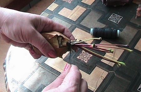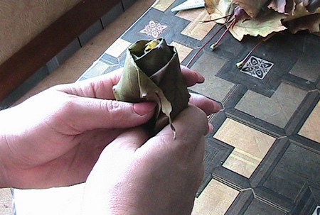 Продолжаем одевать нашу розочу в лепестки из кленовых листьев.
