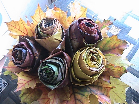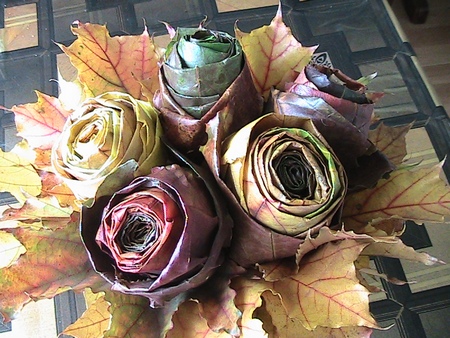 Сделать розочек штук 5-7 и составить букет с кленовыми листочками.