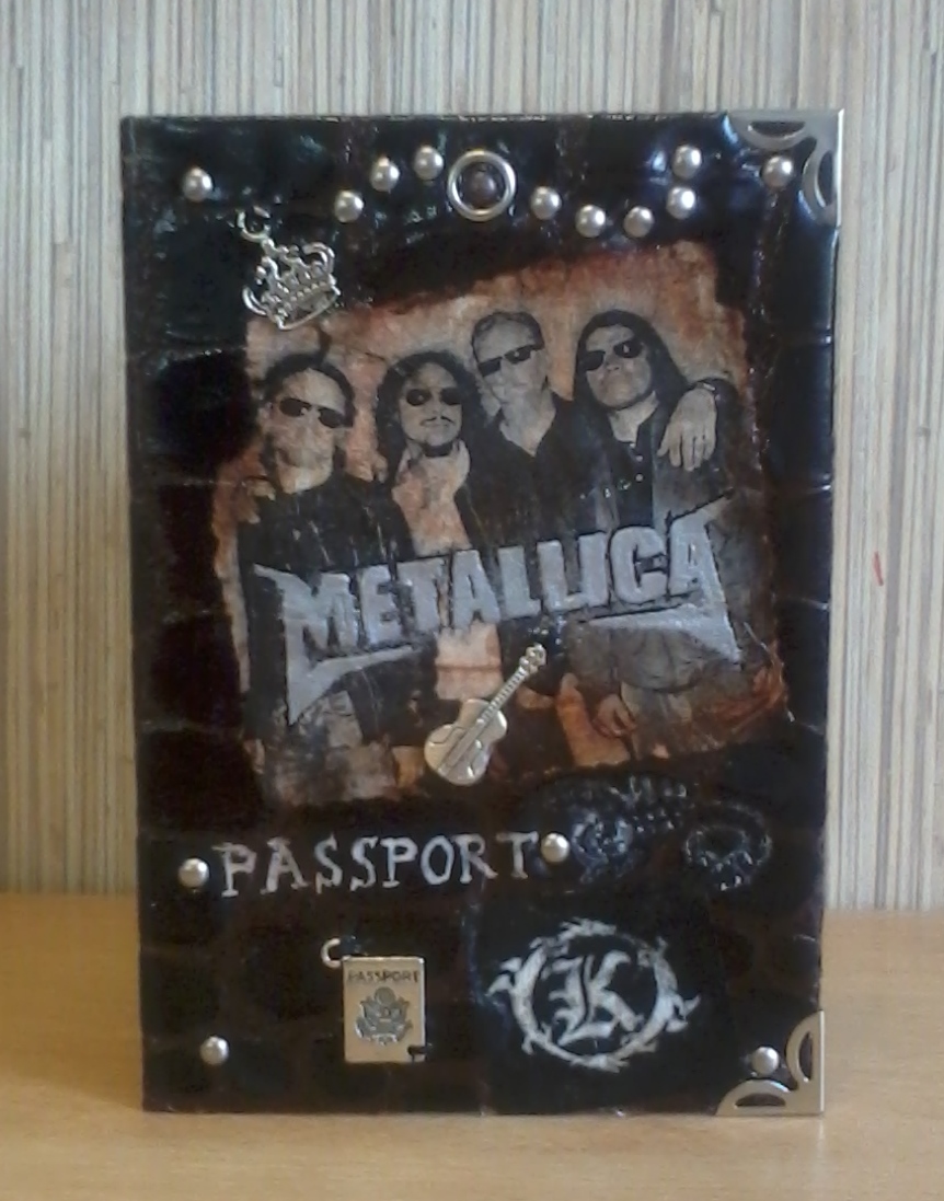 Обложка на паспорт .Дочь попросила сделать в подарок девушке, кот. любит творчество группы "МЕТАЛЛИКА". Вот что получилось - это декуваж на искусственной коже, слово METFLLIKA -горячий эмбоссинг. Картинку из инета распечатала на лазерном принтере на офисой бумаге, истончила с помощью обычного скотча, приклеила к коже на лак паркетный на водной основе, потом состарила , сверху покрыла в несколько слоев этим же лаком.