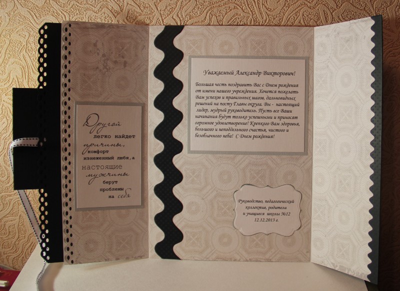 Девочки, я это сделала)))). 2 открытки (размер А4) на Д.Р. мэру нашего города (от школьного коллектива - по просьбе завуча школы, где учится мои внучки). Одна открытка строгая, на второй я "оторвалась".