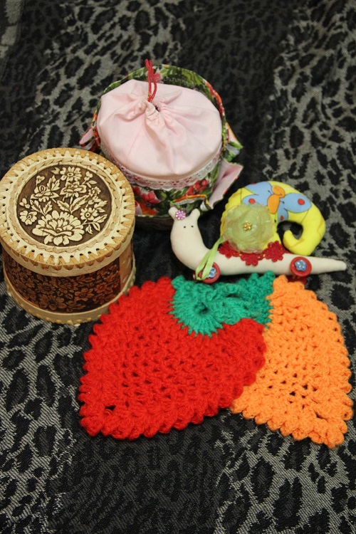 Мила, огромное тебе спасибо от меня и моих домашних!!!! Подарок состоит из корзинки с конфетами, шкатулочки с орешками, очаровательной улитки, прихваток-клубничек, ягод и конфет....