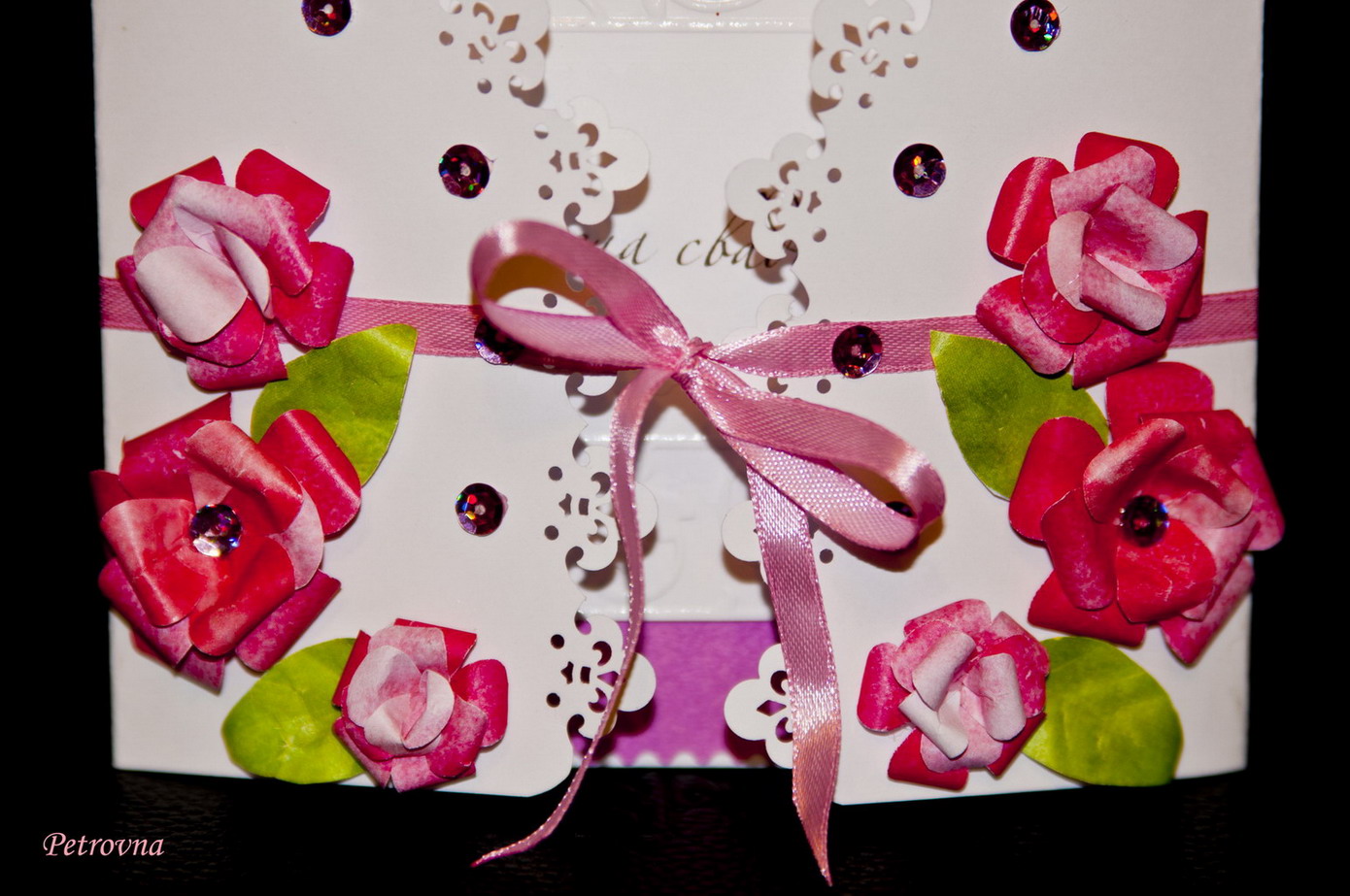 Мой первый конвертик. Пока учусь, никаких специальных приспособлений, кроме ножниц с фигурным краем, нет. Розочку и бутончики с пружинками сделала сама. Не судите строго.