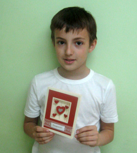 Прошу судей обратить внимание на следующие моменты при оценке этой работы: работа выполнена практически без помощи мамы (это плюс). Но вот тематика выбрана не точно, на мой взгляд открытка больше подходит к дню влюбленных, нежели к дню защиты детей.