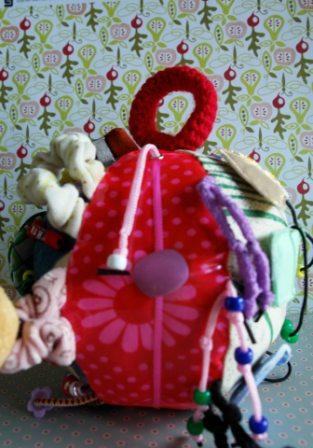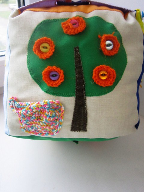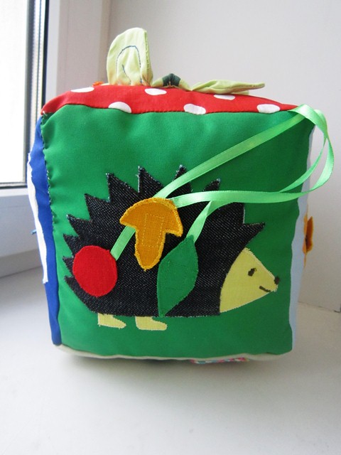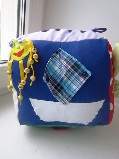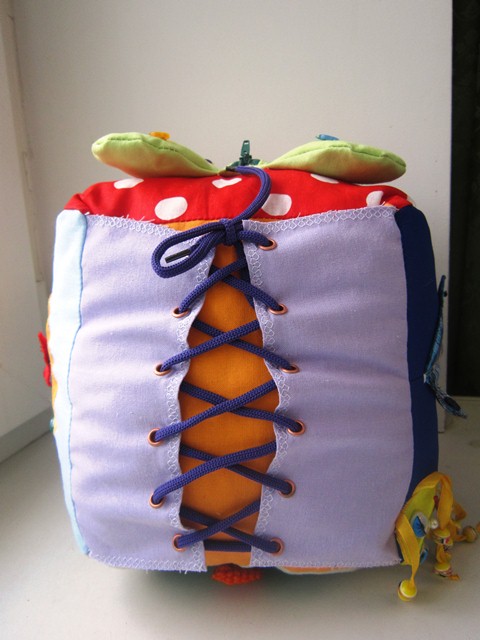 Не нашла кнопки редактирования, поэтому добавлю еще несколько фоток здесь. Еще на одной грани были геометрические фигуры на липучке. Здесь есть лабиринт с пуговичками, "норки", " перетяжка" и пуговицы на шляпной резинке, узелки, бахрома, шнурки.