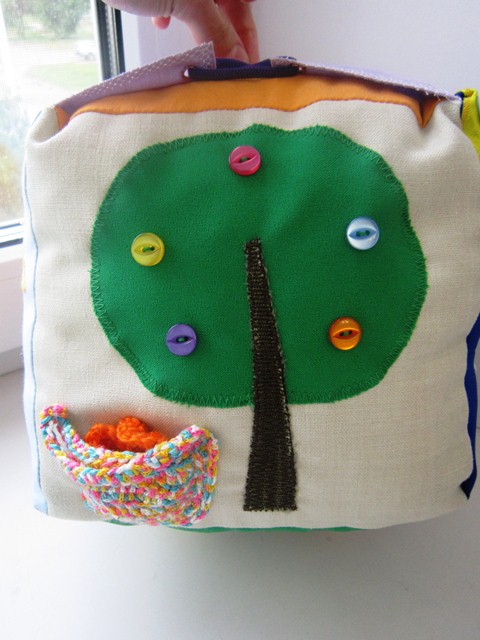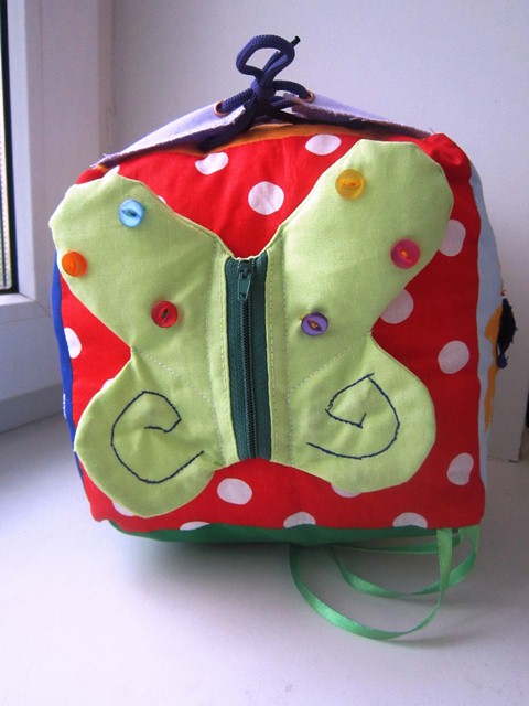 Вот представляю на ваше обозрение мою первую развивающую игрушку для деток от 6 мес. Это развивающий кубик, в котором каждая сторона учит ребенка одеваться, развивает мелкую моторику и логику.