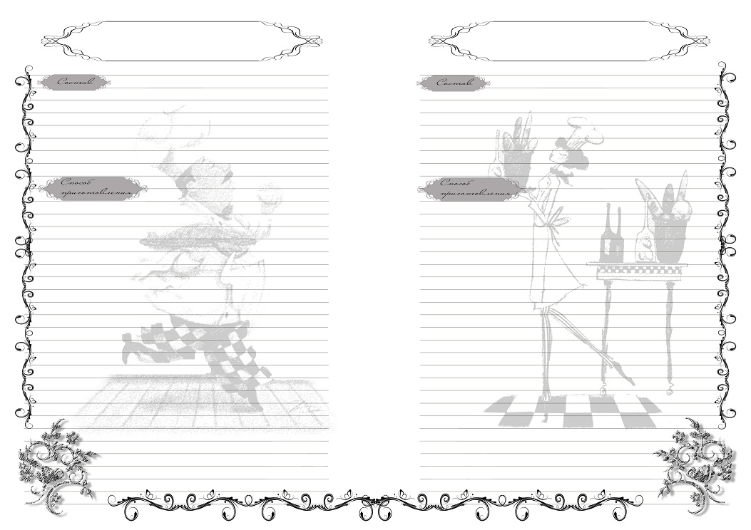 странички делала в программе фотошоп, есть много различных кистей для фотошопа с кулинарной тематикой, а также различные картинки легко превращать в фон, подложку и т.д. с помощью этой программы