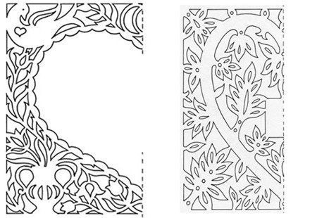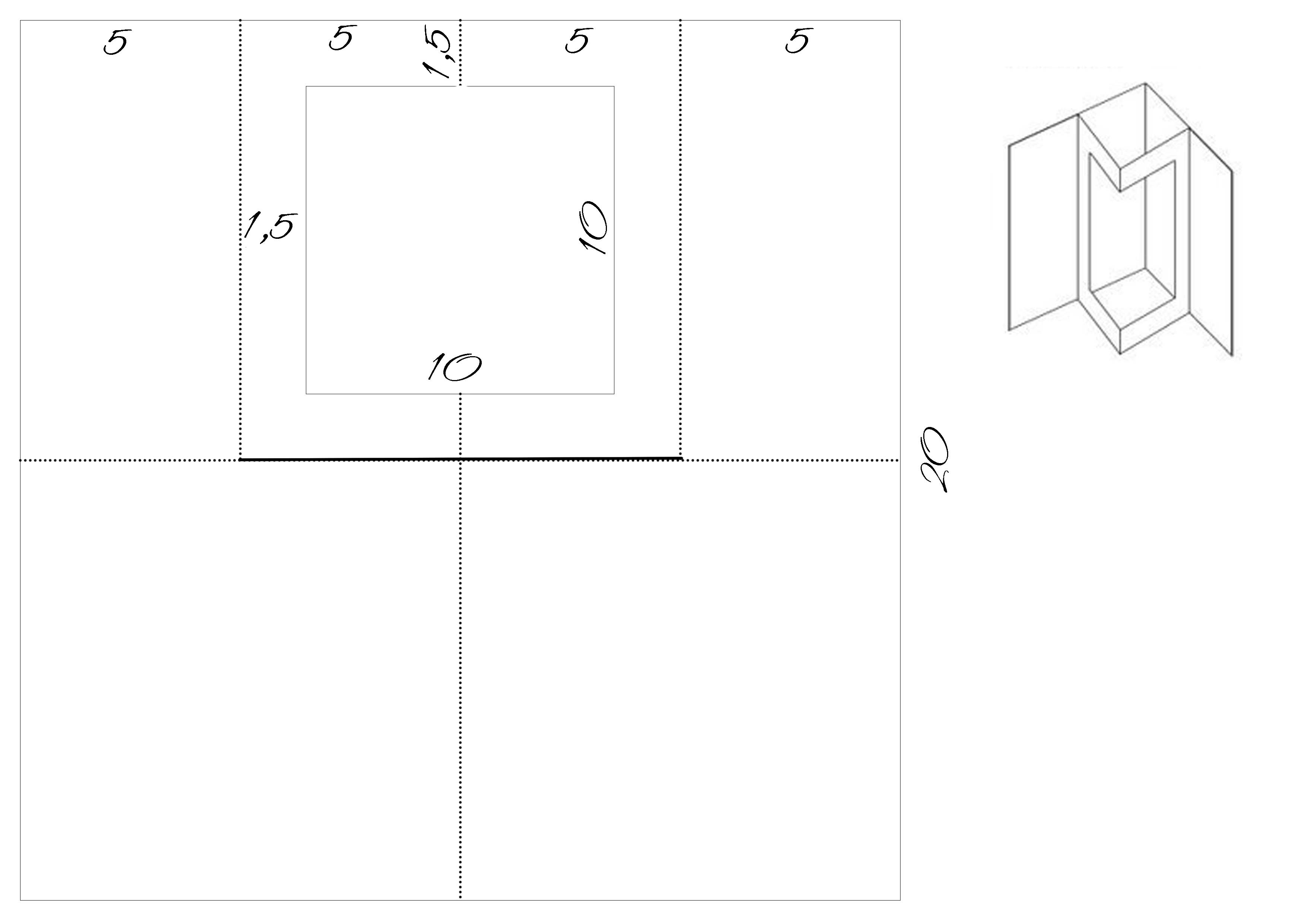 по вертикальным линиям делаем биговки, а по горизонтальным прорезаеми загибаем так как показано на картинке с готовой открыткой